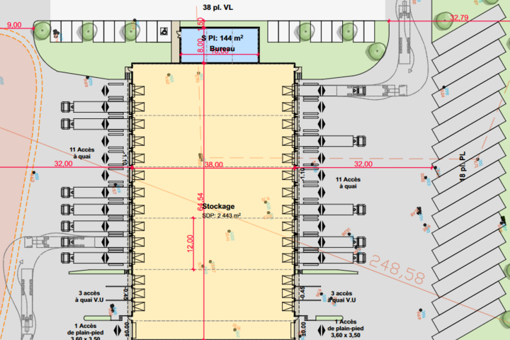 Ce bâtiment à une hauteur libre de 6,5 m et dispose de 28 portes de quai et d'accès de plain-pied.