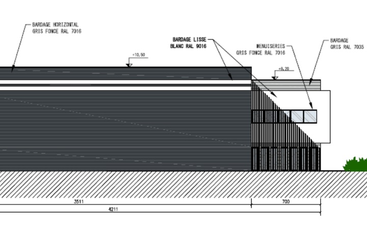 - bardage métallique nervuré, panneau sandwich gris beige et gris foncé, et bardage bois à clairevoie verticale.